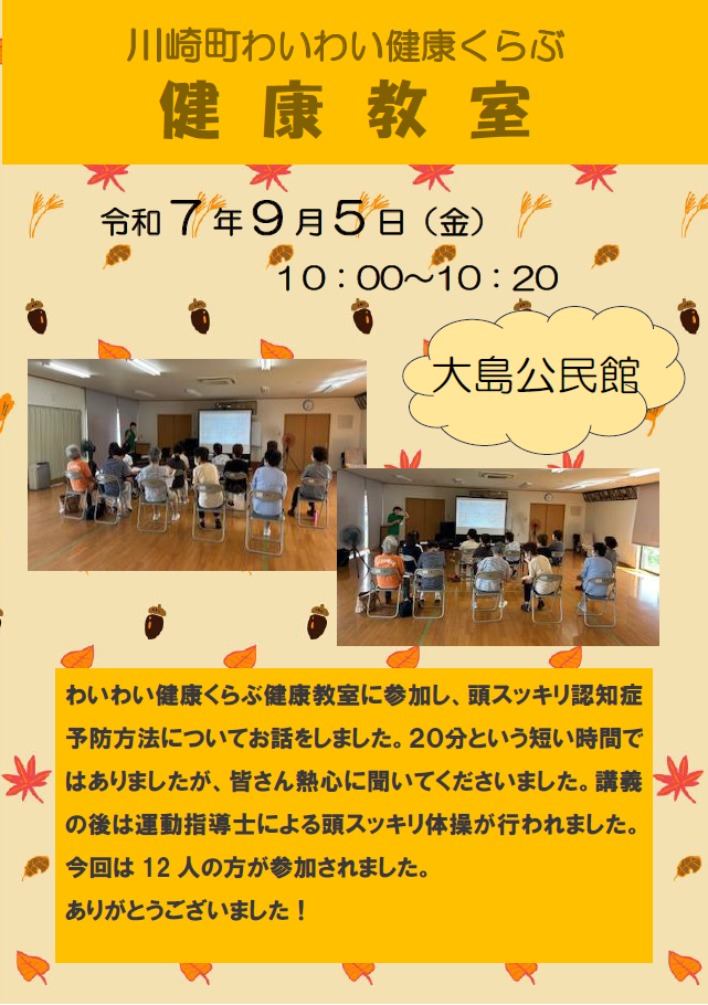 トップページ > お知らせ一覧 > お知らせ > 認知症医療センター > 「川崎町わいわい健康くらぶ 健康教室」で大島公民館に伺いました(頭スッキリ認知症予防方法)