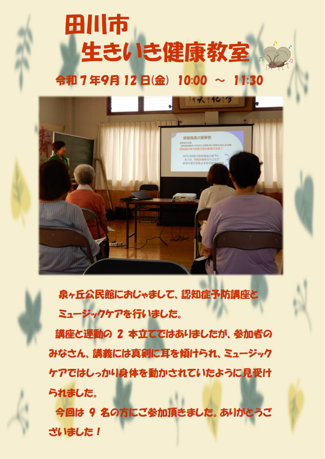 トップページ > お知らせ一覧 > お知らせ > 認知症医療センター > 「田川市生きいき健康教室」で泉ヶ丘公民館に伺いました(認知症予防講座+ミュージックケア)