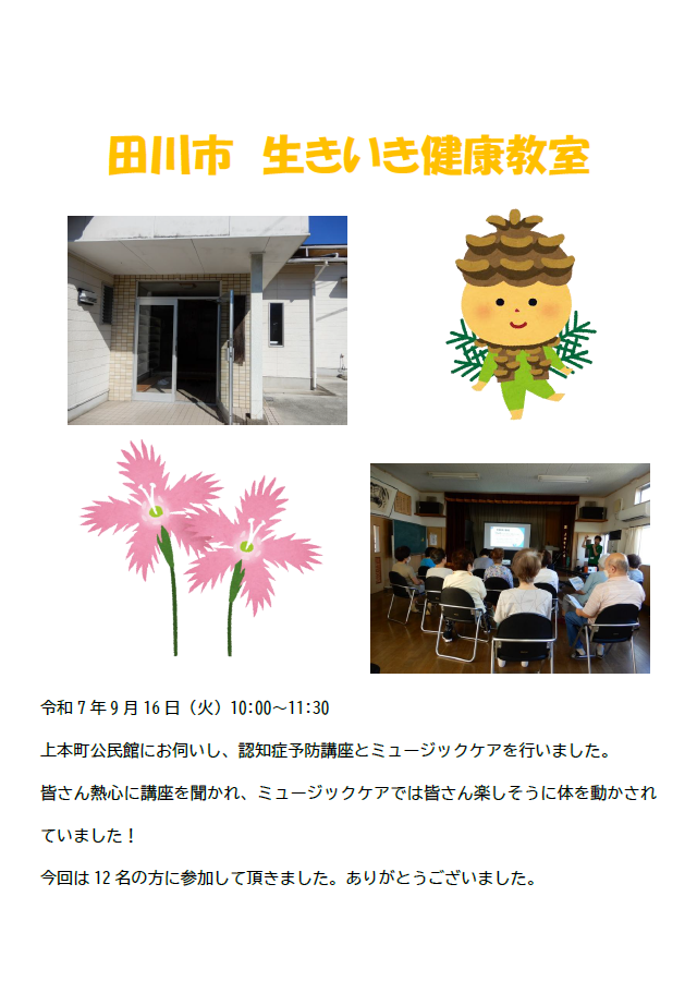 「田川市生きいき健康教室」で上本町公民館に伺いました(認知症予防講座+ミュージックケア)
