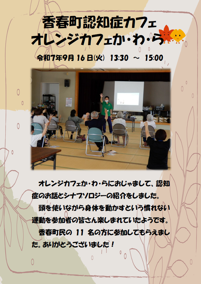 トップページ > お知らせ一覧 > お知らせ > 認知症医療センター > 香春町認知症カフェ「オレンジカフェ か・わ・ら」に 伺いました(講和+シナプソロジー)