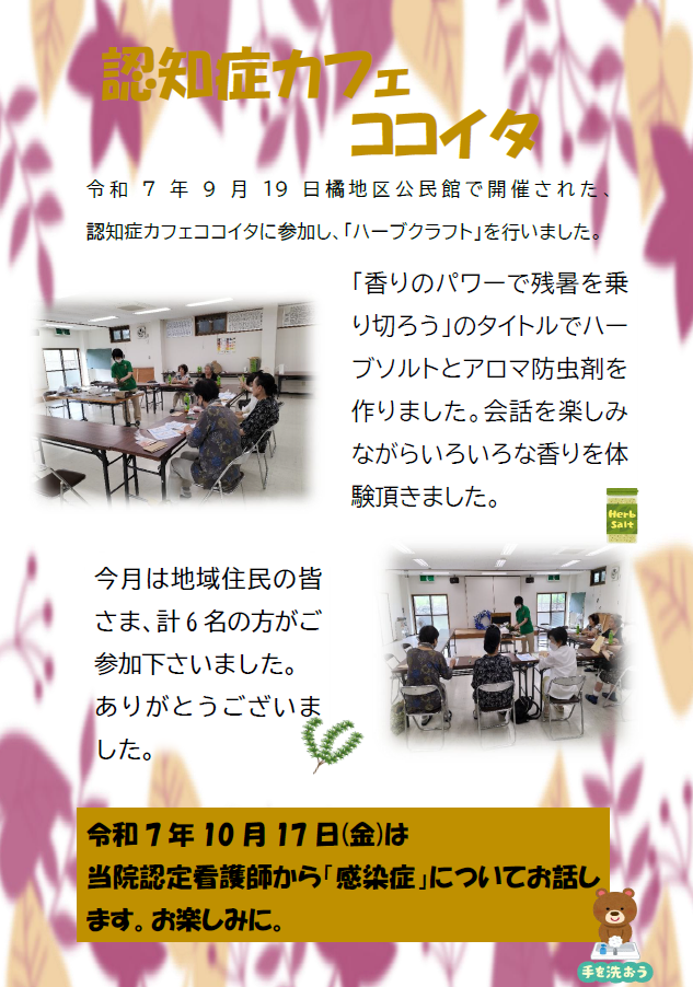 トップページ > お知らせ一覧 > お知らせ > 認知症医療センター > 「認知症カフェ ココイタ」で橘地区公民館に伺いました(ハーブクラフト)