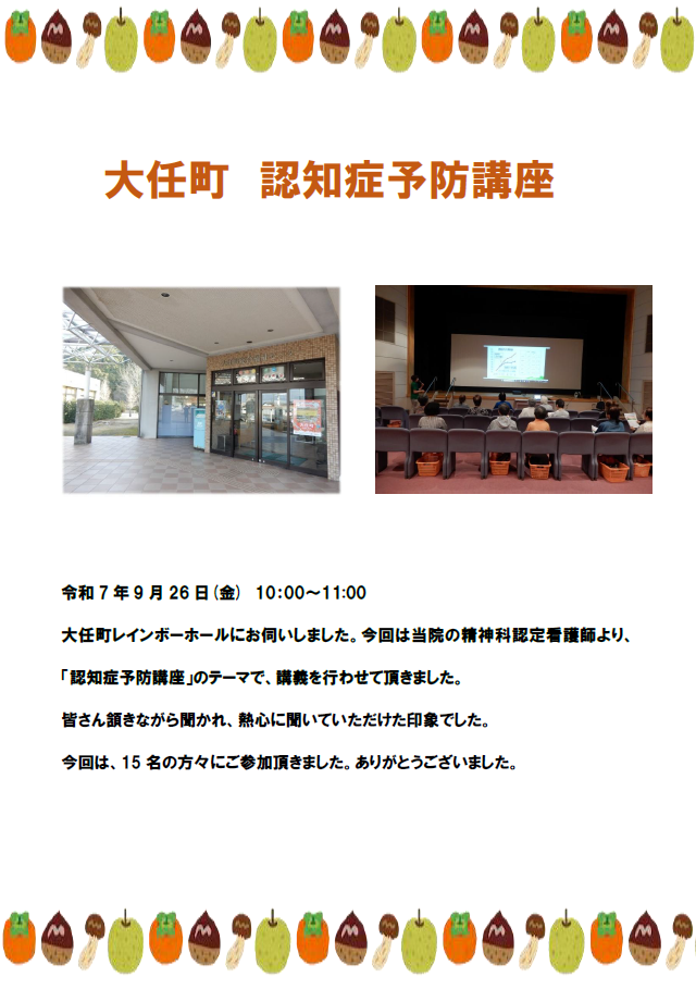 トップページ > お知らせ一覧 > お知らせ > 認知症医療センター > 「大任町 認知症予防講座」で大任町レインボーホールに伺いました(認知症予防講座)