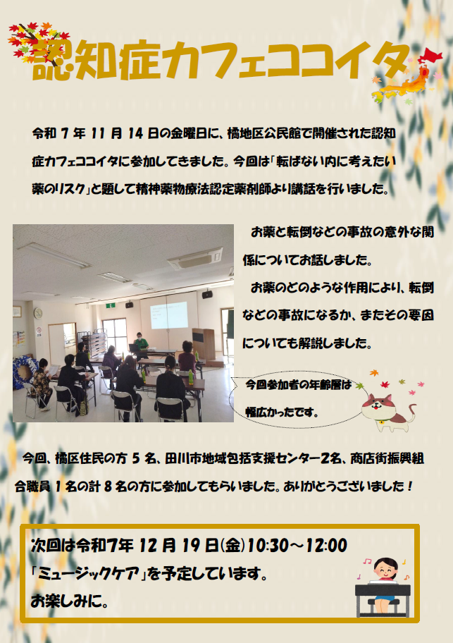 トップページ > お知らせ一覧 > お知らせ > 認知症医療センター > 「認知症カフェココイタ」に参加しました(転ばない内に考えたい薬のリスク)