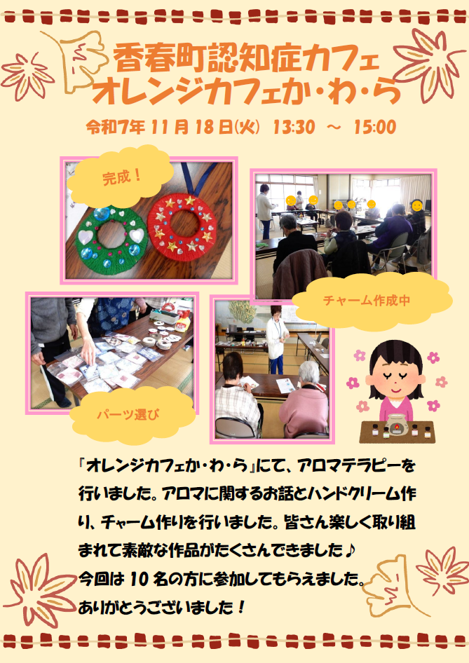 トップページ > お知らせ一覧 > お知らせ > 認知症医療センター > 香春町認知症カフェ「オレンジカフェか・わ・ら」に伺いました(アロマテラピー)