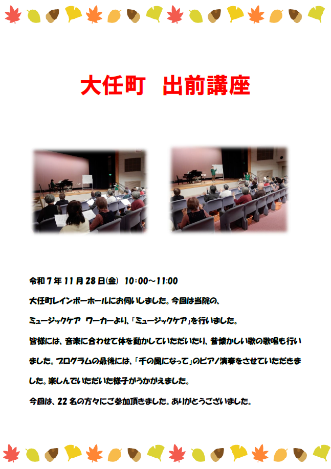 トップページ > お知らせ一覧 > お知らせ > 認知症医療センター > 「大任町 出前講座」で大任町レインボーホールに伺いました(ミュージックケア)