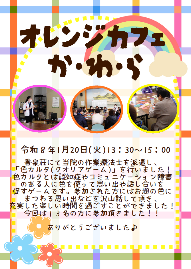 トップページ > お知らせ一覧 > お知らせ > 認知症医療センター > 「オレンジカフェ か・わ・ら」に伺いました(色カルタ)