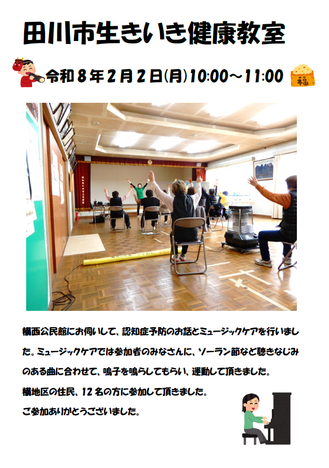 トップページ > お知らせ一覧 > お知らせ > 認知症医療センター > 「田川市生きいき健康教室」で糒西公民館に伺いました(認知症予防のお話+ミュージックケア)