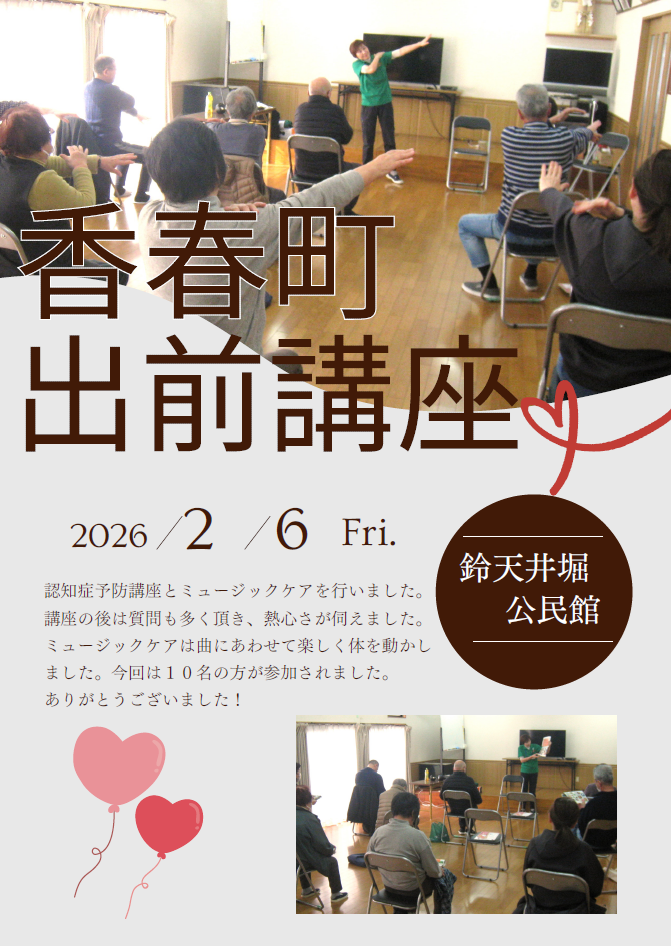 トップページ > お知らせ一覧 > お知らせ > 認知症医療センター > 「香春町出前講座」で鈴天井堀公民館に伺いました (認知症予防講座+ミュージックケア)