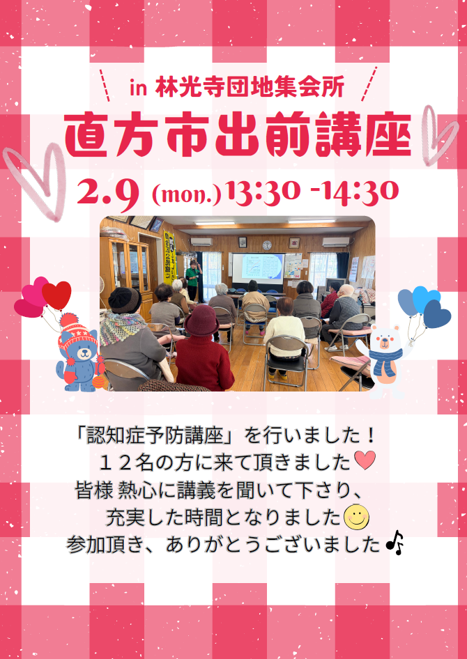 トップページ > お知らせ一覧 > お知らせ > 認知症医療センター > 「直方市出前講座」で林光寺団地集会所に伺いました(認知症予防講座)